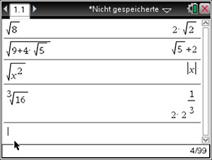 Ein graphischer Taschenrechner (GTR) arbeitet nur mit rationalen Näherungswerten, das CAS ist in der Lage, exakt zu arbeiten und hilft Fehler zu vermeiden (links CAS, rechts GTR).