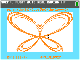 To do so, press the y= key. Then in r1, input the equation for the butterfly curve above. Then press the zoom key. Again, either press 0 or arrow down to ZoomFIT. Now, you should be feeling all fuzzy inside.