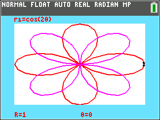 Press the y= key. In r1, input cos(2θ). Then, in r2, enter sin(2θ). Next, press the zoom key. Then, you will need to enter 0 or ZoomFIT to complete your masterpiece.