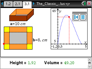 The Box_Problem_Calculus.tns document takes a classic problem from calculus and uses the dynamic linking capabilities of TI-Nspire Technology to enact the problem in multiple representations: diagrammatic, graphic, numeric, geometric and symbolic. The problem is posed on the title screen shown at the right.