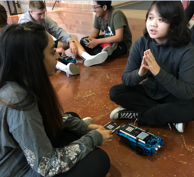 “I didn’t know that you could program with a calculator, at all, so this was really interesting,” said Aurea Le, a freshman in Brown’s class. She and classmate, Bayaan Musa, worked together to program their Rover to dance to a Bruno Mars song. “We are trying to sync it with the lyrics of the song so that when it says go there, we are having Rover go left and right,” said Musa. They wrote a program to make Rover drive left, right, backward and spin in a circle.