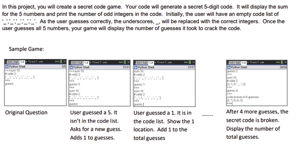 We are almost halfway through the school year, and I can’t really imagine the end of the course yet. I’m still getting to know my students. However, it will be here sooner than we can imagine. (For some of us that could be January if on a semester schedule.) When it is time to wrap up the course, there are two end-of-course projects. They use all the basic skills: conditional statements, selection, functions, repetition and lists. They would make a great practice for an AP® Computer Science Principles project. They set up the problem. Below is the sample “Crack the Code” setup.
