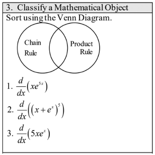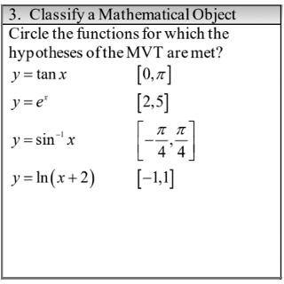 The “Classify a Mathematical Object” task is sometimes tough to write. I’ve done matching, Venn diagrams, and other various classification items. Here is an example of one that uses a Venn diagram and one where the students are to circle the ones that meet the criteria given. In the MVT one to the right, the students had calculators to be able to graph the function over the given interval to make a decision about the hypotheses.