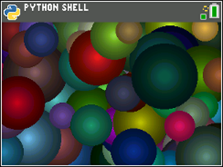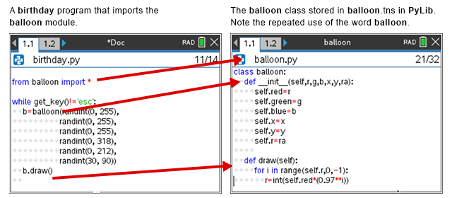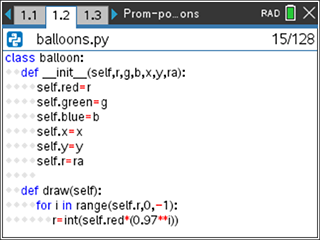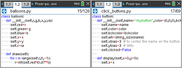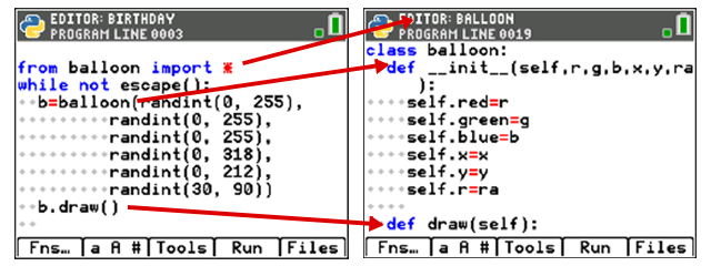 The same code structure works on the TI-84 Plus CE Python. Just write the balloon.py module containing the balloon class and then write the birthday.py program, importing the balloon.py module: