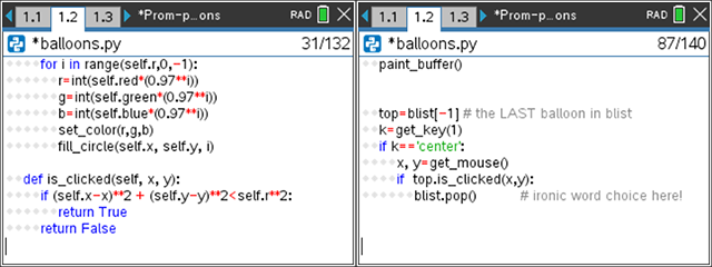 The is_clicked() method on the left is invoked after using get_key() and get_mouse() functions as seen in the right image. If the key pressed is the “center” key (that’s the center of the touchpad or a mouse-click on a computer), then x, y = get_mouse() is used to get the current mouse position on the screen (in default coordinates regardless of any window setting). Then the last balloon, top = blist[-1], is checked to see if it was clicked by calculating the distance of the point (x, y) from the center of the balloon using the distance formula. If it is clicked, then the balloon is removed (popped) from the list of balloons and the screen is redrawn (in the buffer). pop() is a built-in list function that deletes or removes the last element from the list.