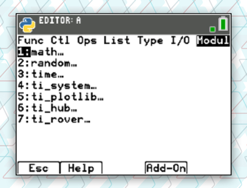 Some modules are provided in the Python App, and you can find them by entering either the Editor or the Shell and selecting <Fns…> Modul. Additional modules may be found in the <Add-On> sub menu in the Modul screen.
