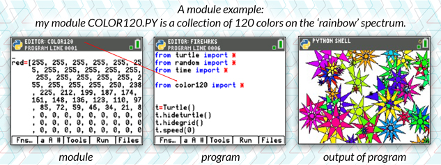 - COLOR120.py is a module I wrote that lets me use 120 bright colors of the rainbow to make random colors more vibrant. The module just contains three special lists: red[ ] (partially shown above), green[ ] and blue[ ].