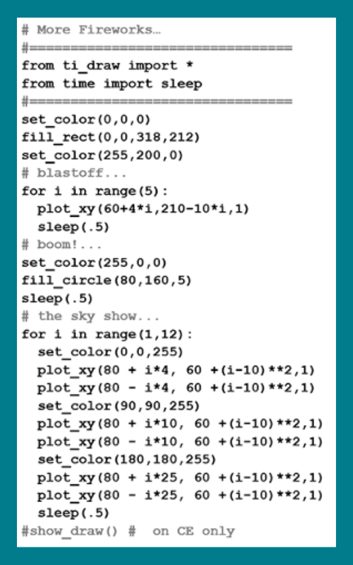 Finally, let’s end with another style of firework display with this coding challenge. This design is modified from a completely different activity and is another great example of what a little bit of experimentation can do after learning basics from the TI Codes modules.