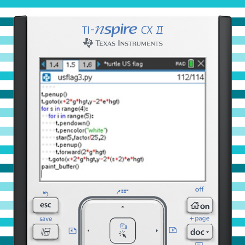 Now that you know how to make some stars, let’s add some stripes! This U.S. flag is a modification of an activity that draws out the Texas flag. Using flags as an artwork template is a great opportunity to explore and experiment with your coding skills. Drawing the Texas flag activity can be found in the same Python modules section of TI Codes — this time under TI Draw > Mini Project 2 (MP2) section.
