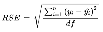 As is common with residuals, some values are positive and others are negative. We cannot just work with them this way because we don’t want them canceling each other out. The practice in statistics is to square these residuals. This will result in all positive values. Then the squared values are added, then divided by the degrees of freedom. The degree of freedom is the number of values in a data set minus the number of parameters in the model. For Holly’s data, the degree of freedom will be 8 - 1 = 7. Finally, the square root of that number is found to give the Residual Standard Error (RSE). The formula is provided below.