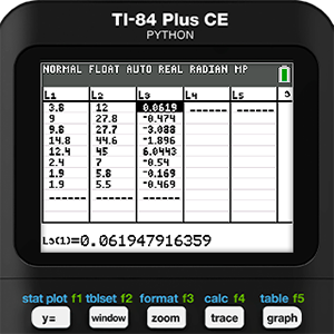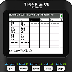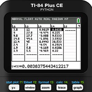 Mathematical modeling is never as simple as running a bunch of regressions and picking the one with the r-value closest to 1 or -1, which is another reason we have come to love this activity so much. Residuals should be an important part of the process, but since we didn’t run a regression we will need to use the features of the calculator to find them manually. As a reminder, a residual is defined as the actual measured y-value minus the y-value predicted by the model. So, in this case we use list operations and enter the formula L2 - Y1(L1) in the heading for L3.