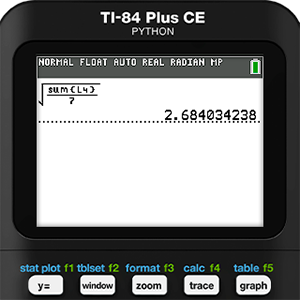 To complete this formula for Holly, we need to square L3 in the next list, L4. Then in the home screen we can take the square root of the sum of L4 divided by 7. This gives Holly a Residual Standard Error of 2.684.