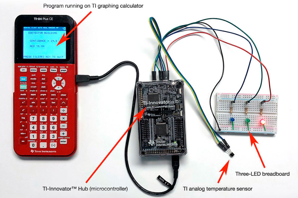 The TECHNOLOGY portion of STEM is obvious since they are actually using technology to build technology. They are making a working temperature probe. They will use a microcontroller device, like the TI-Innovator Hub™ with TI LaunchPad™ Board, a breadboard and components, as well as a graphing calculator or computer to write the code that makes it all work.