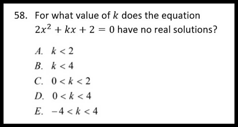 How does that help answer this question? If you know that the axis of symmetry is on top of the y-axis when b = 0 and the graph moves in a symmetrical fashion, well, answer choice E (-4>k<4) is the only answer choice that is symmetric around the value of zero, so it must be the answer. If you learned the concept, you don’t even have to see the graph to know the answer. No calculations are necessary.