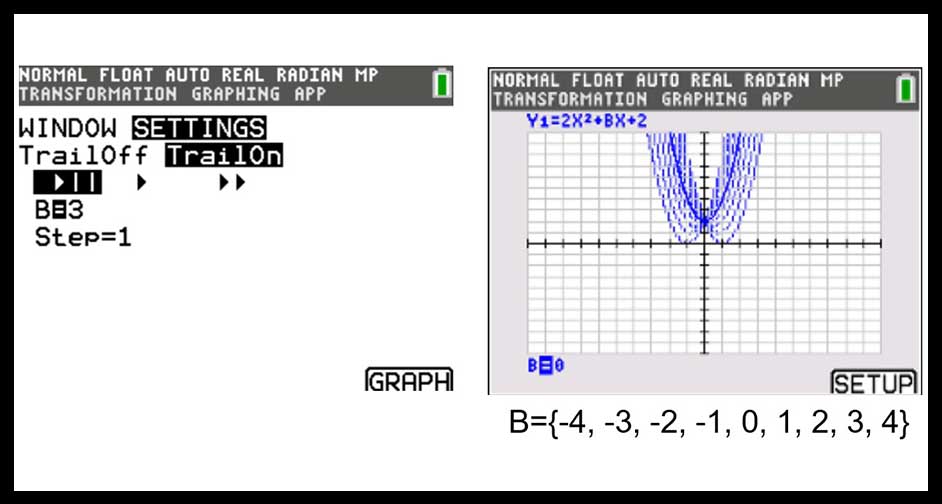 Using the recently improved Transformation app on the TI-84 Plus CE provides an illustration of the movement that changing the value of b has on the graph. Here are the steps to graph the function using the Transformation app: